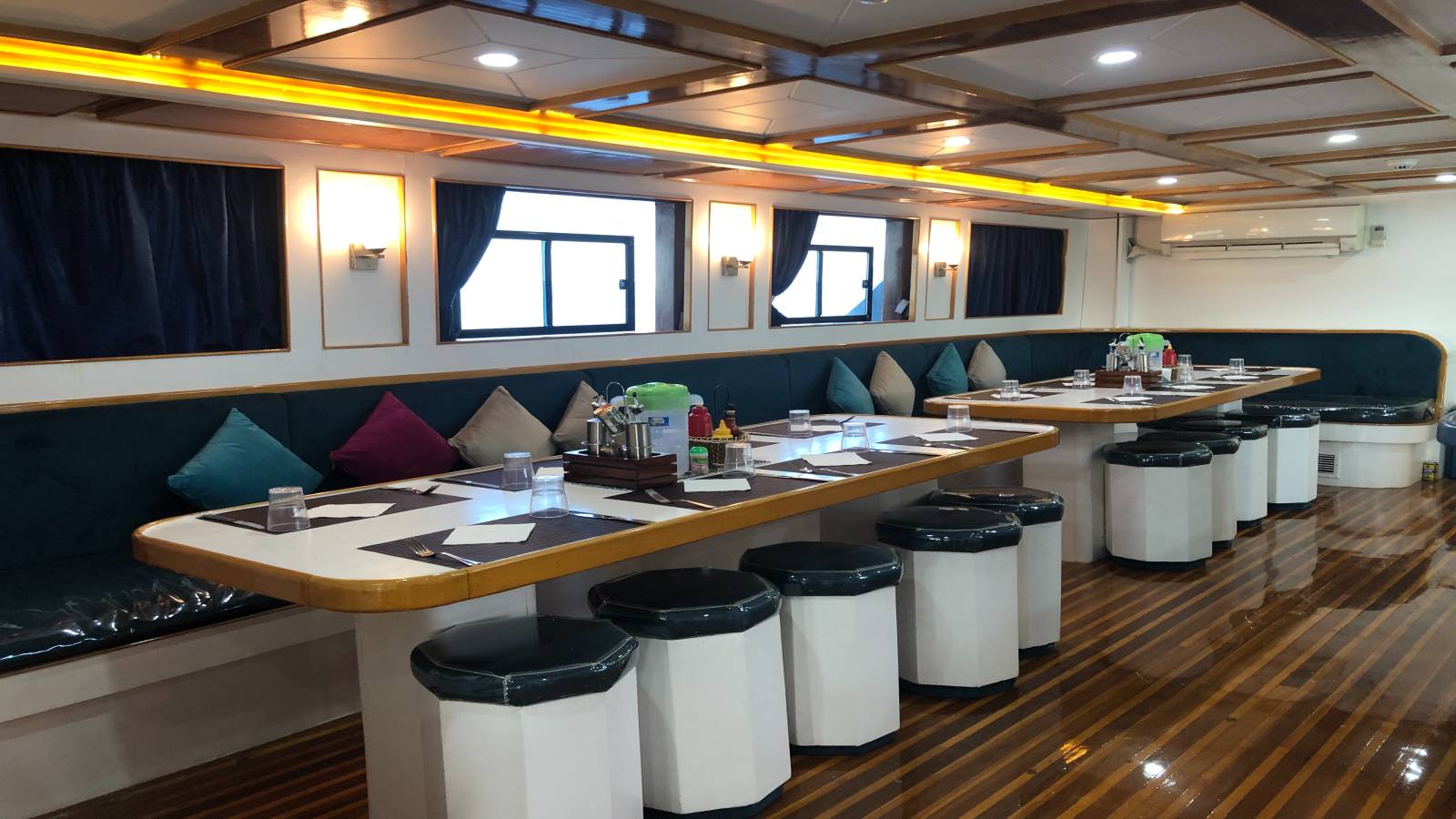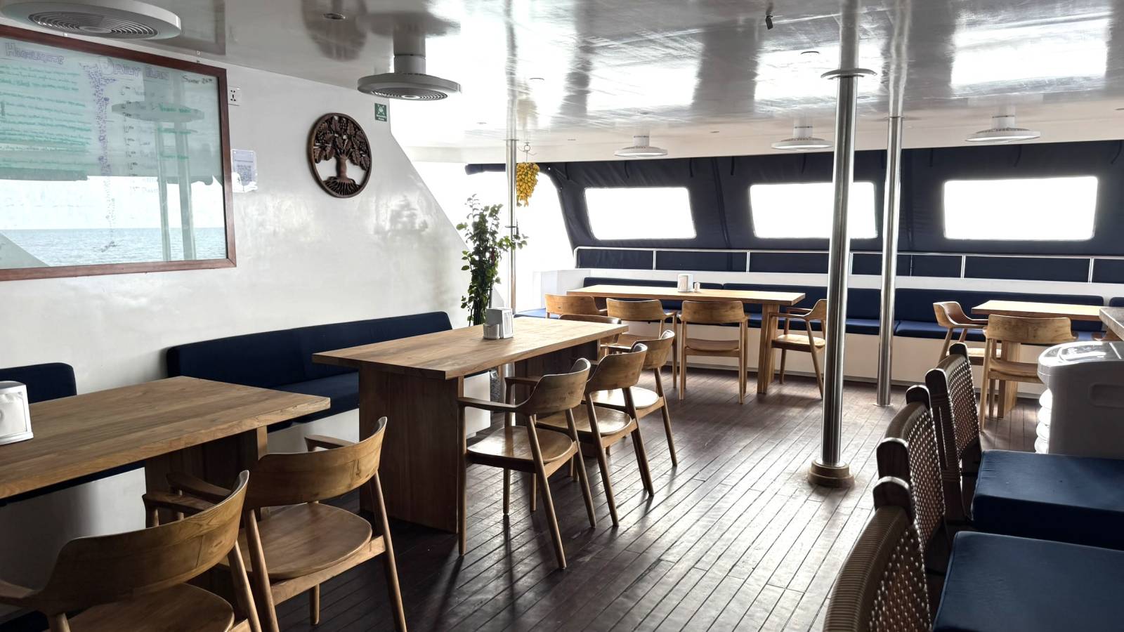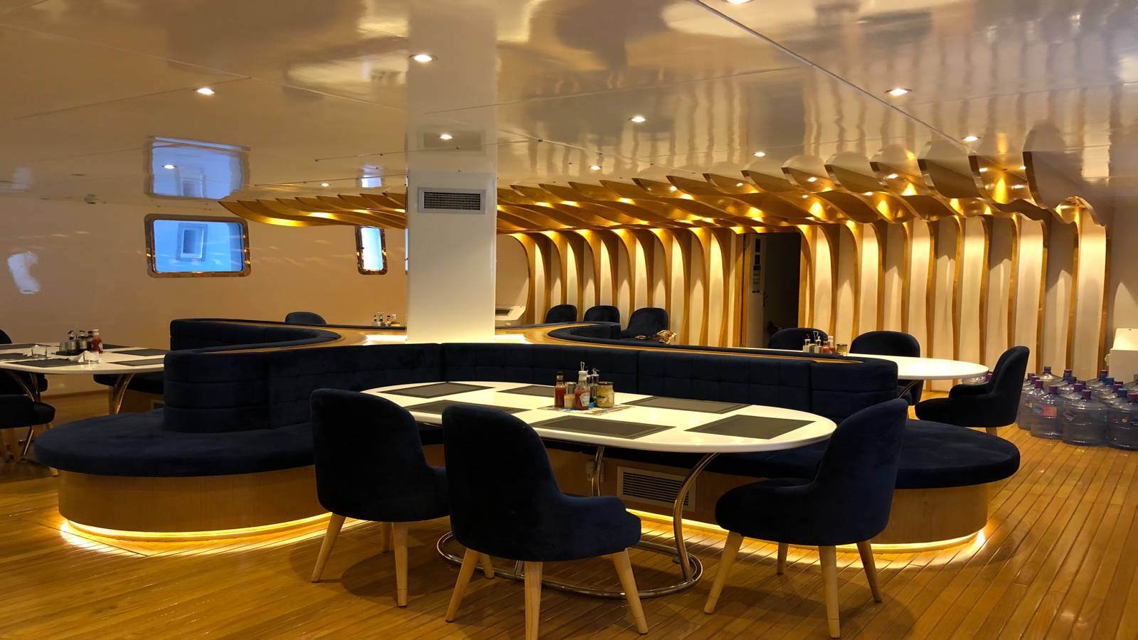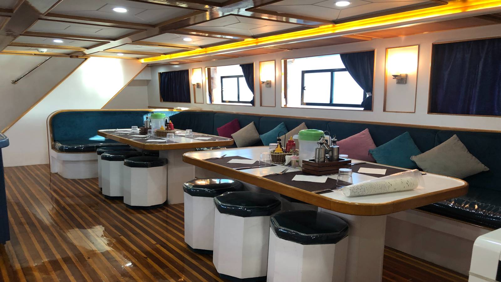 Le pont inférieur constitue la salle restaurant, dans un design chaleureux.